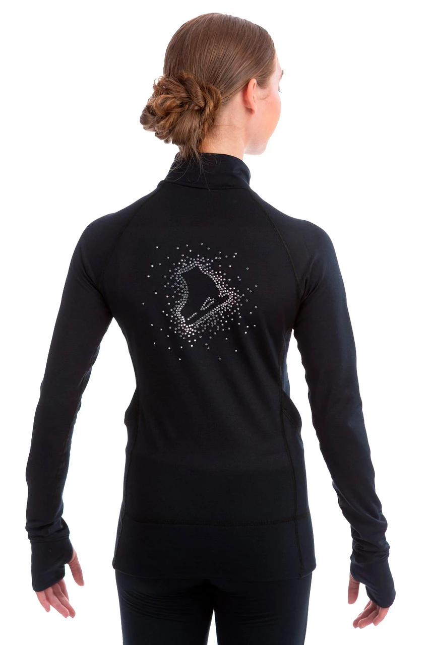 Black figure skating training jacket with side pocket and silver color beading accent in the back from the Pastel Sprinkle Skate Collection of Elite Xpression
