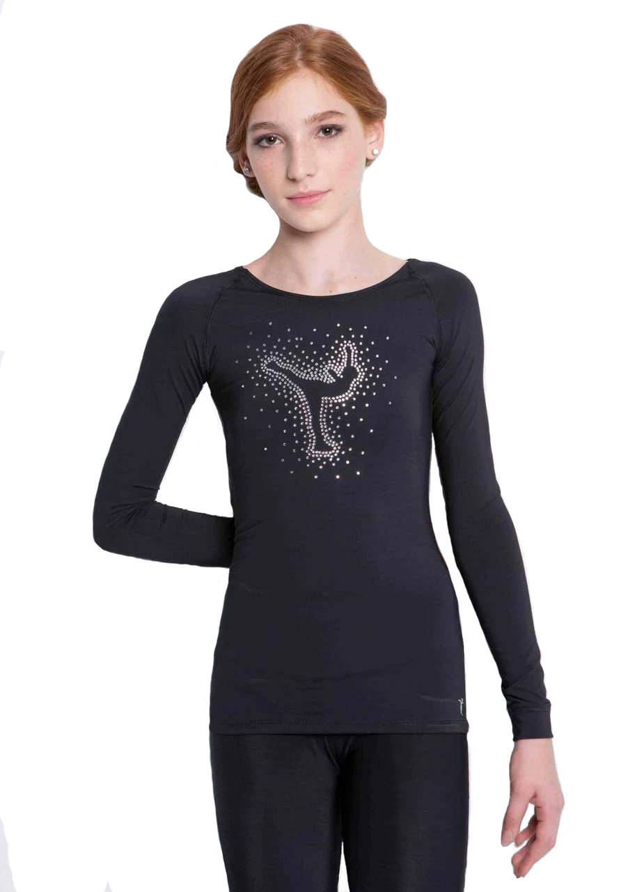 Bling figure skating training top decorated with rhinestones in a pattern of a figure skater doing a spiral Elite Xpression.