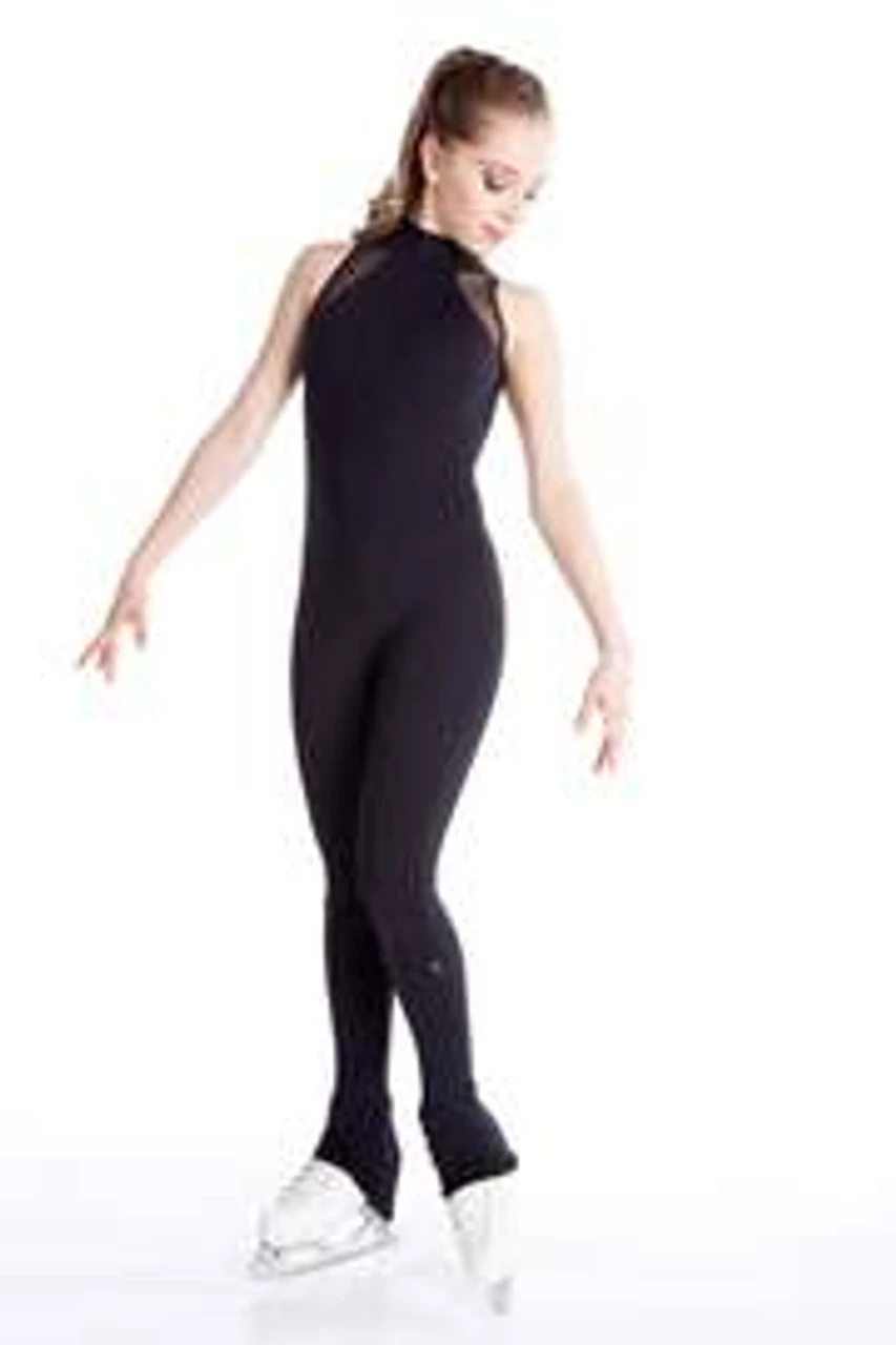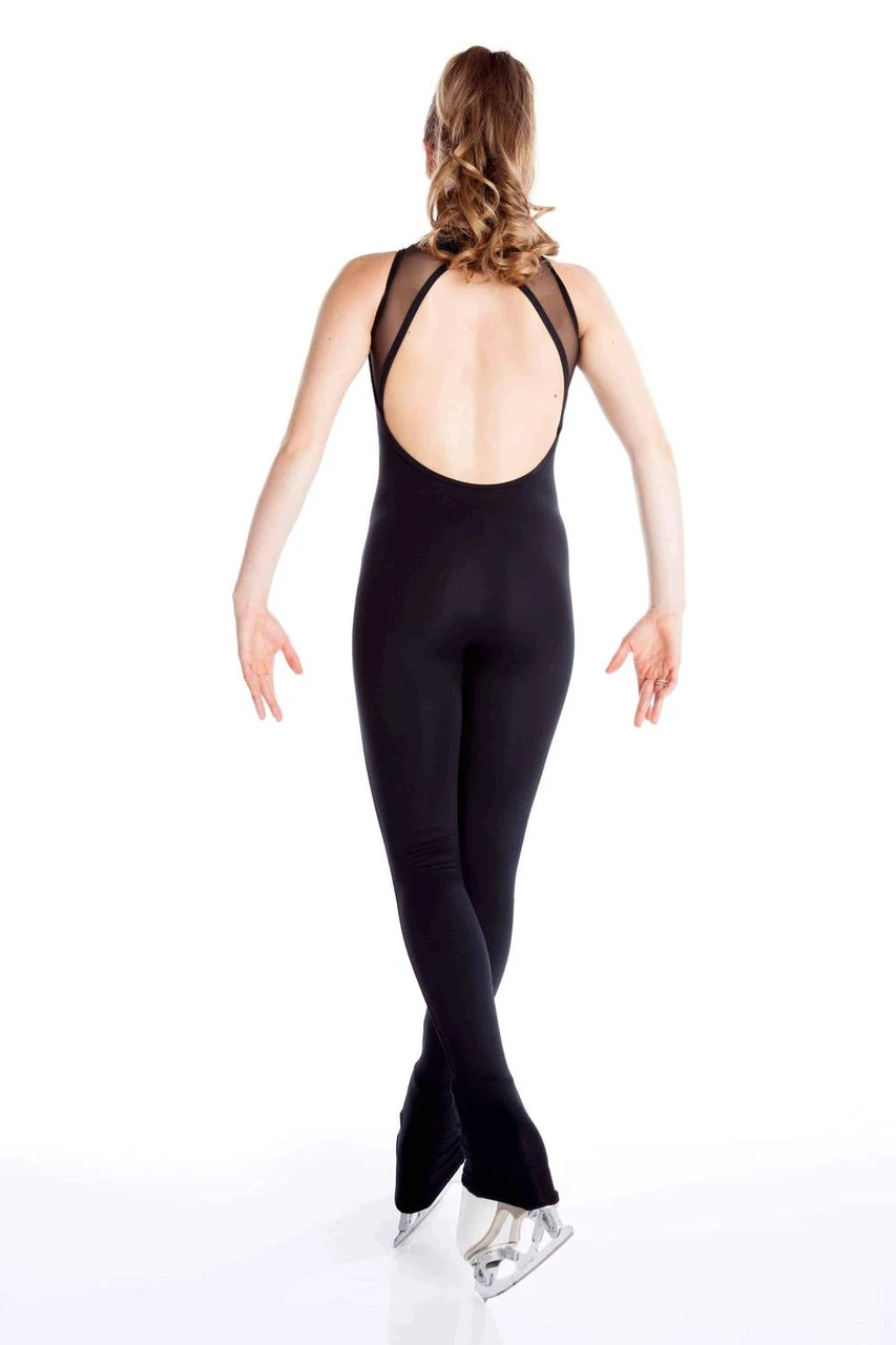 Training one piece in black supplex without sleeves with mesh inserts and opened back for figure skating or dance Elite Xpression.
