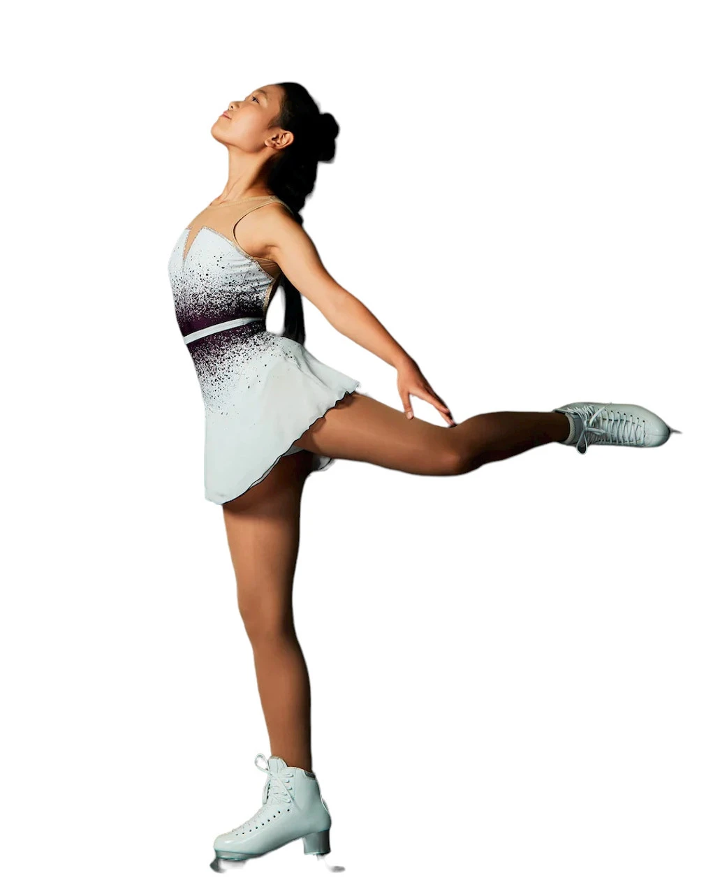Figure skating sleeveless white dress with printed purple bodice and a chiffon skirt from the collection Elite Xpression.