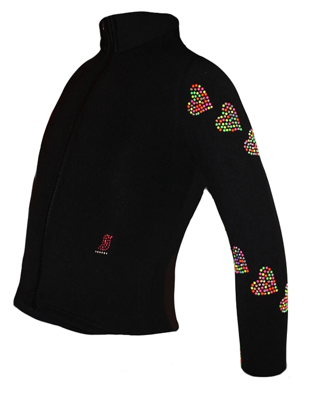 Neon bright rhinestuds and rhinestones swirls around the left sleeve of the jackets in “Spiral Hearts” pattern and make this jacket eye-catching on the ice. Featuring over 800 randomly mixed AB clear rhinestones and neon pink heart design studs. Enjoy skating and look great on the ice with premium ice skating jacket by Ice Fire – your way to shine!
