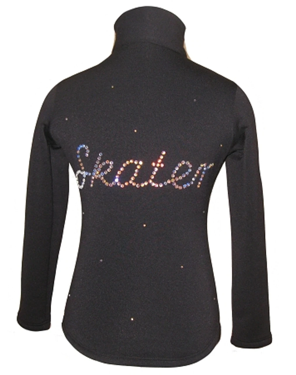 Polartec power stretch ice skating jacket with “Skater” rhinestones applique. Over 100 sparkly clear AB crystals. Rhinestones size 3mm. Great for every day practice and competition event. Fitted style without a hood and high performance Polartec fabric ideal for ice skating that demand freedom of movement, moisture management, and warmth.
