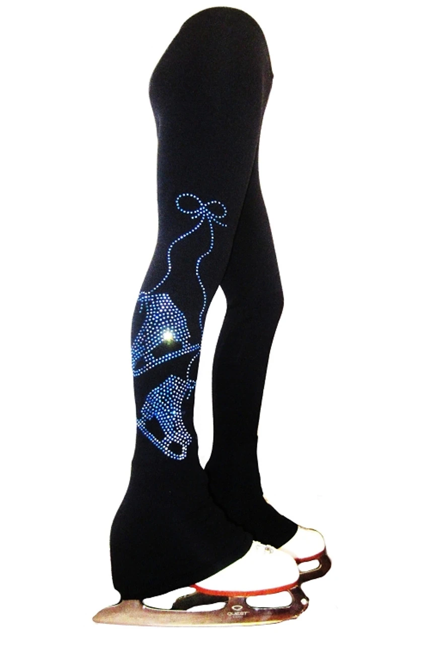 Polartec power stretch ice skating pants with blue crystals “Pair of Skates” rhinestone applique.