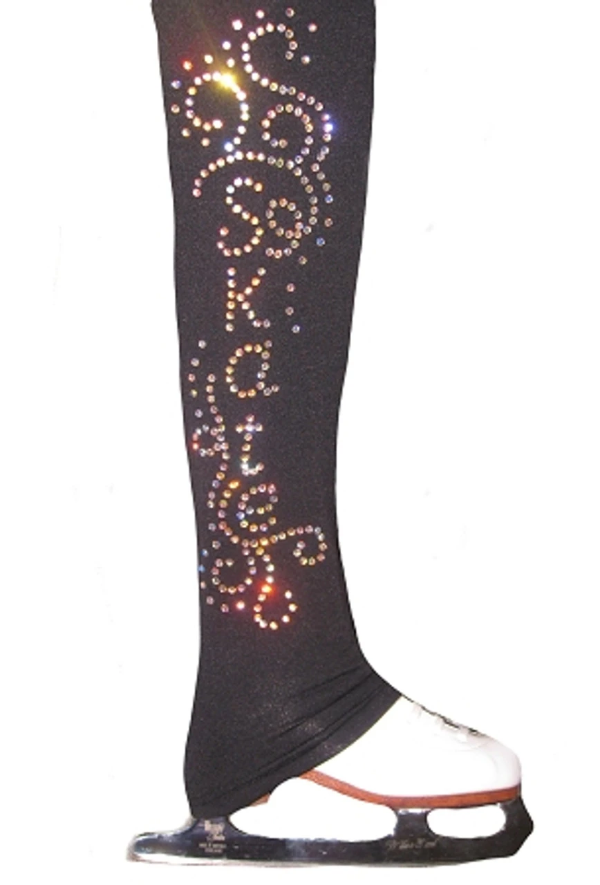 Polartec power stretch ice skating pants with “Skate and Ornament” rhinestone applique.