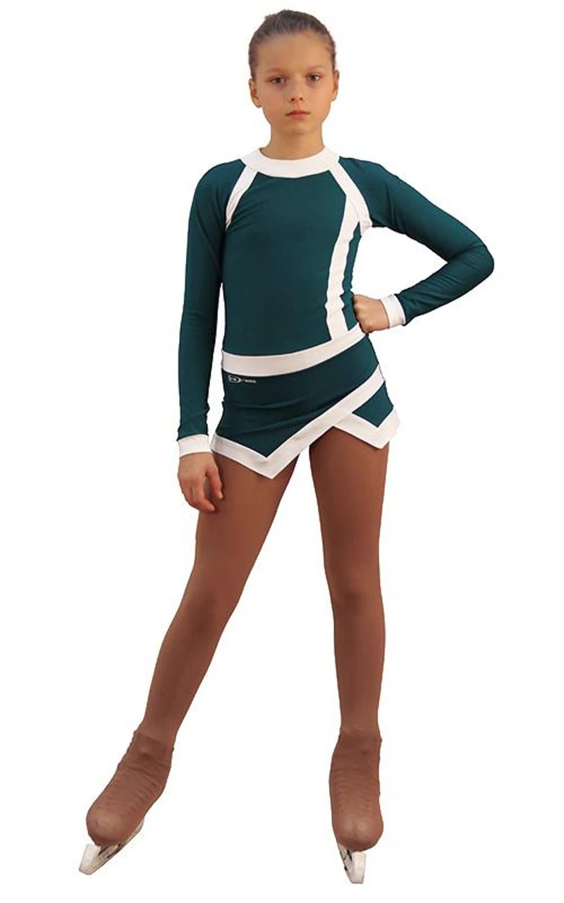 The contrasting colour combination, bright sporty design and the original designer’s solution were the basic points when creating this model. Asymmetrical lines of a complex configuration, the sporty design of the skirt, Raglan sleeve and fit – all this attracts the eye. In this dress your child will be guaranteed to stand out on the ice and feel like a leader.