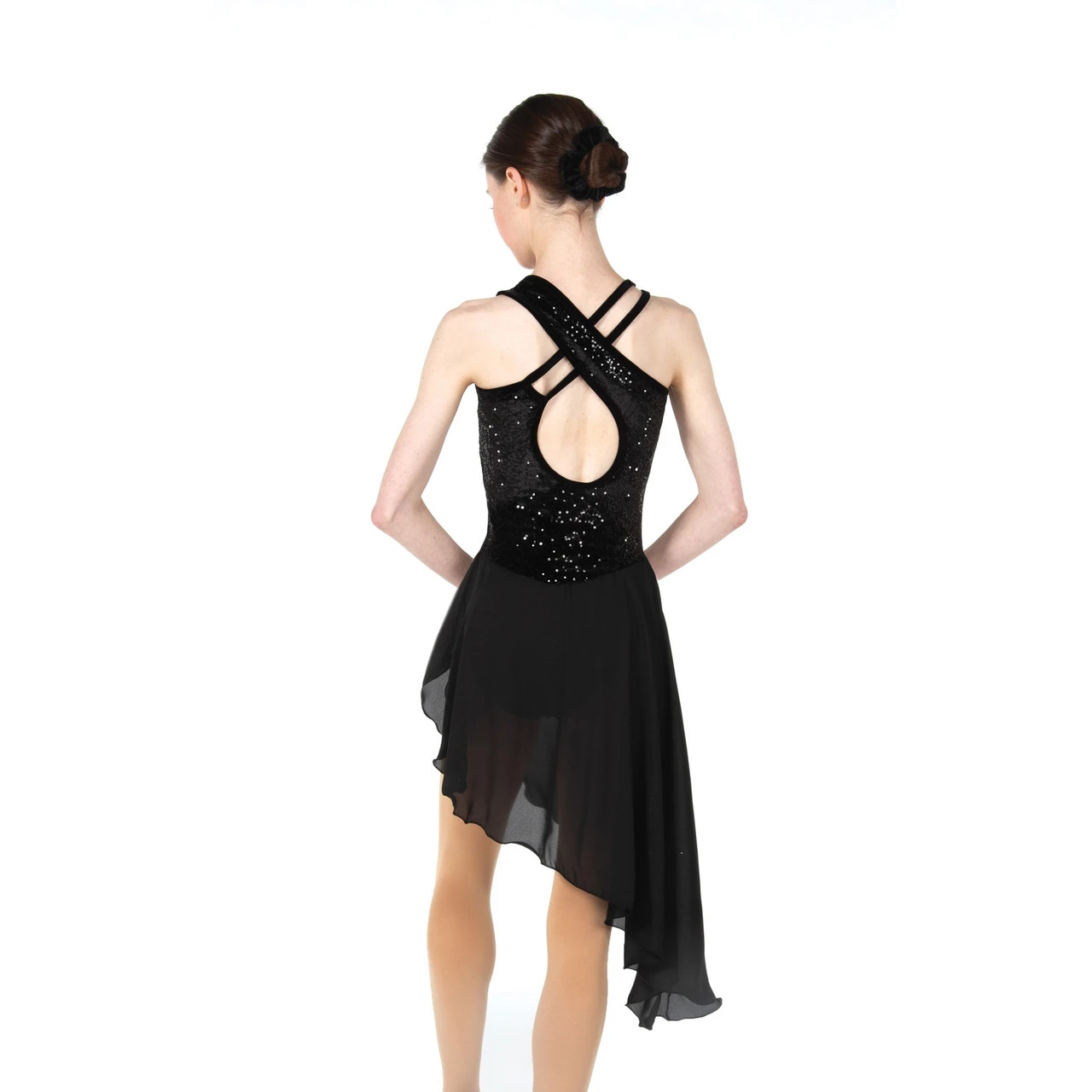 A little ritzy, a little edgy, all out glam. Full sequin velvet body with a slim stiletto style keyhole at one shoulder and a pair of spaghetti straps at the other. Designed with a crossed keyhole back and angled georgette skirt.