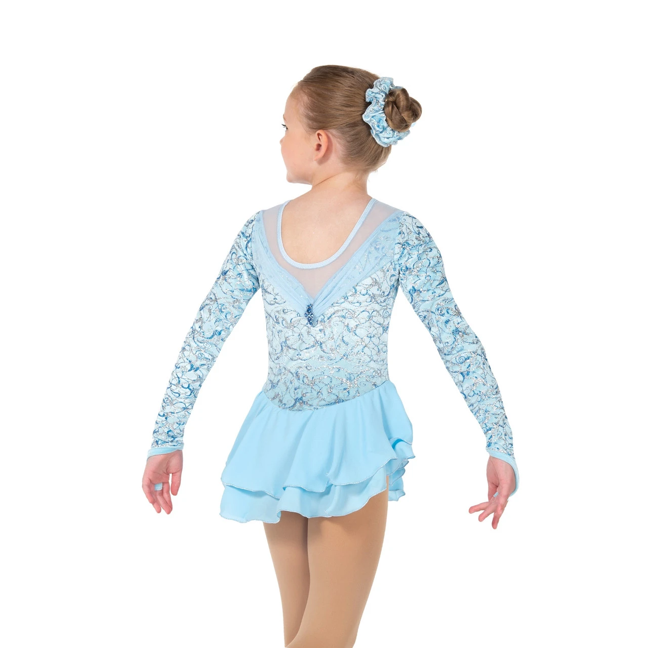 Crystal blue velvet dress with silver and sapphire glitter, gently gathered mesh along the shoulders and a double layer princess style skirt. Lined.