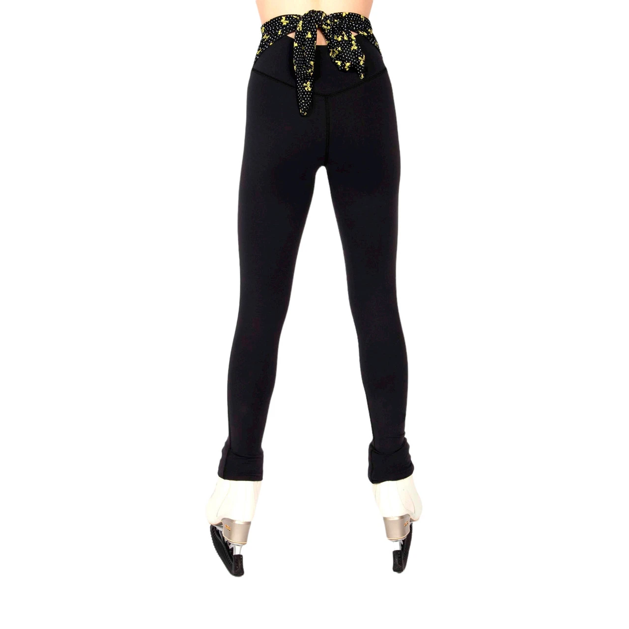Black supplex leggings with flat stitched seams and a wide waistband in dainty print bows that ties at the small of the back.