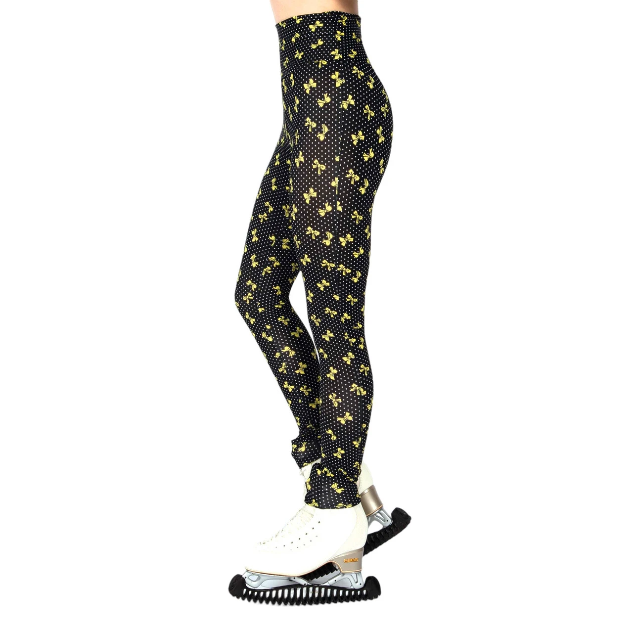 Whimsical bow print lycra leggings with a wide contoured waistband for a sleek fit.
