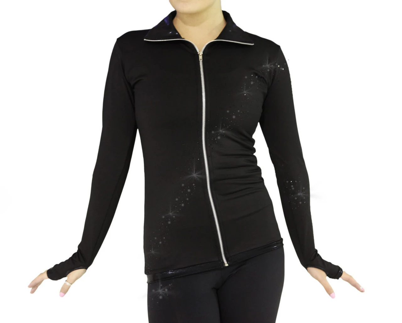 This beautiful jacket is made from supplex four way stretch material. It is decorated by crystal in a spiral like design that took the ice skating fashion by storm. Black trim makes the jacket really pop when you hit the ice. Extremely comfortable to skate in and a great fashion statement. The sleeves come with a thumb loop for when you don’t want to wear gloves and need extra protection.