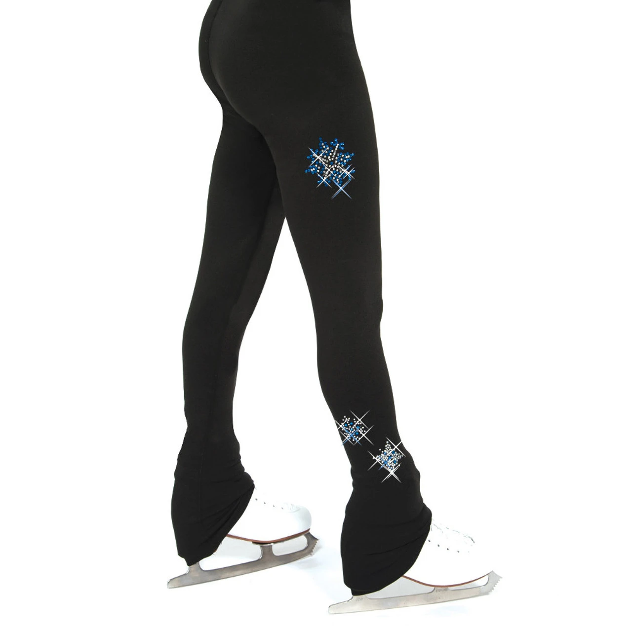 Cozy black fleece leggings with sparkling crystal snowflakes on one leg. Smooth fit waistband and elastic at the heels that keeps the legging securely under the heel.