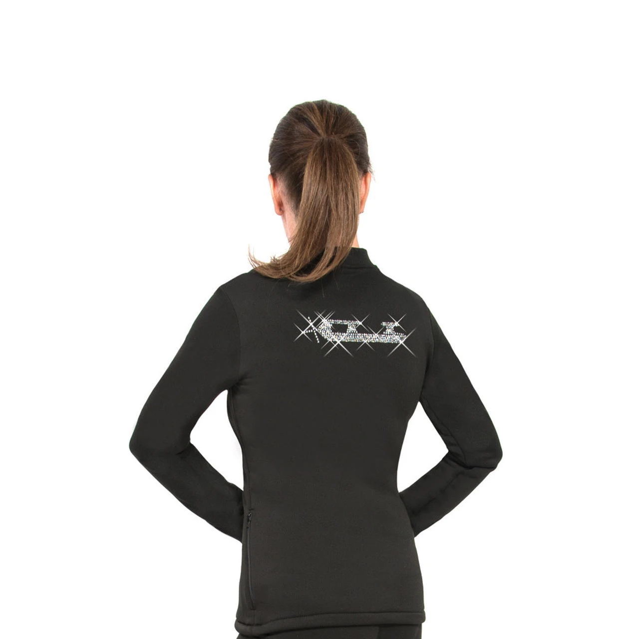Warm black fleece jacket with full front zipper and a sparkling crystal blade across the back.
